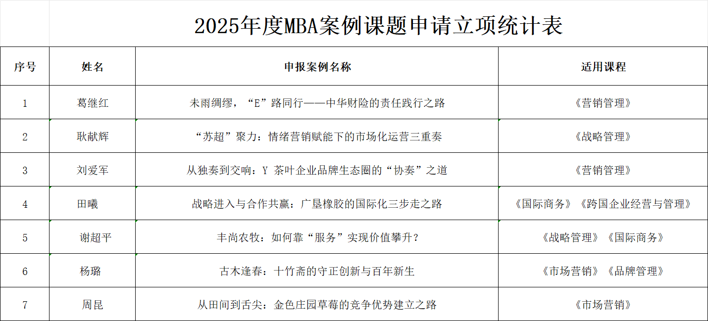 根据《南京农业大学MBA案例建设管理办法》要求,2025年MBA教学案例建设项目经教师个人申报、评审组评审、学院党政联席会议审定,现将2025年MBA教学案例建设项目立项名单公布如下: